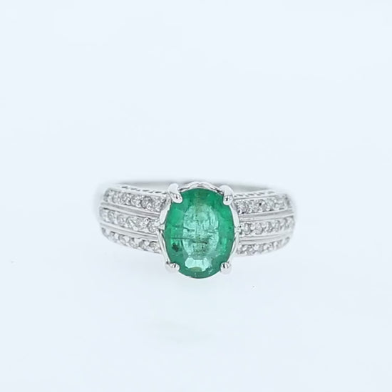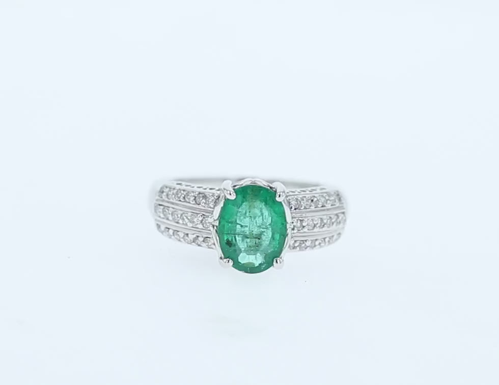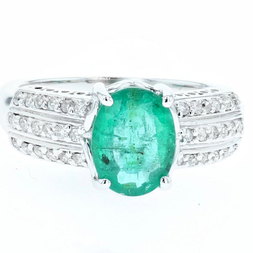 Crafted with attention to detail and expertly selected materials, this 14K white gold ring is a beautiful and elegant addition to any jewelry collection. The 1.63ct oval emerald is expertly cut for maximum sparkle and brilliance. Accompanied by 0.35ct/tw of brilliant cut diamonds, each with VS clarity and G color, this ring is the perfect combination of luxury and quality.